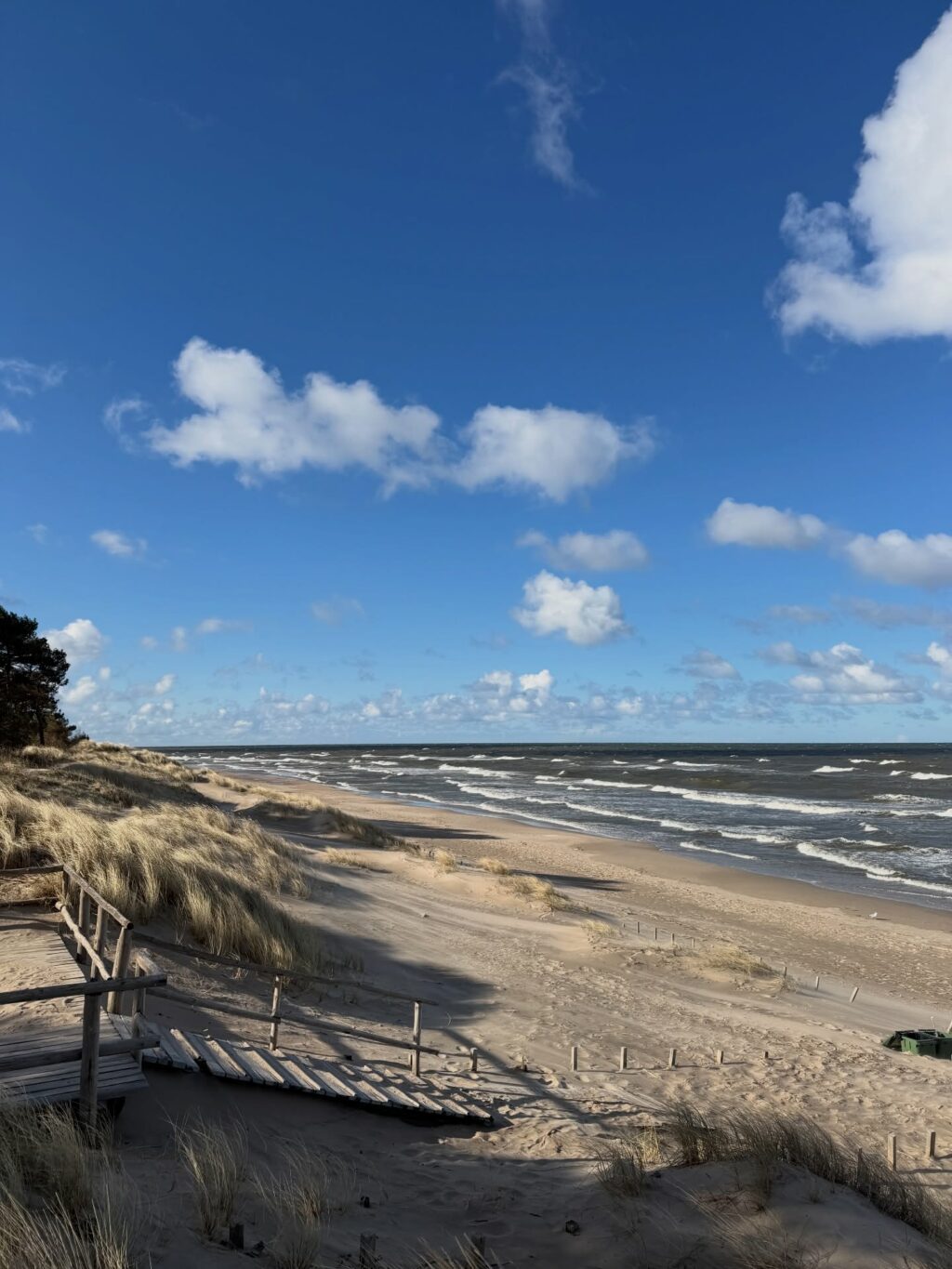 Bet ne tik žiemą. Pavasarį ne sezono metu — kai dar ne viskas atidaryta, bet jau šviečia saulė, jau daug šviesos, apie pusę devynių vakaro dar gali eiti pajūriu — tai irgi atskira magija. Ramus paplūdimys. Tušti suoliukai prie tilto. Botanikos parkas, kuriame 18 kilometrų takelių — ir tu vienintelis eini.